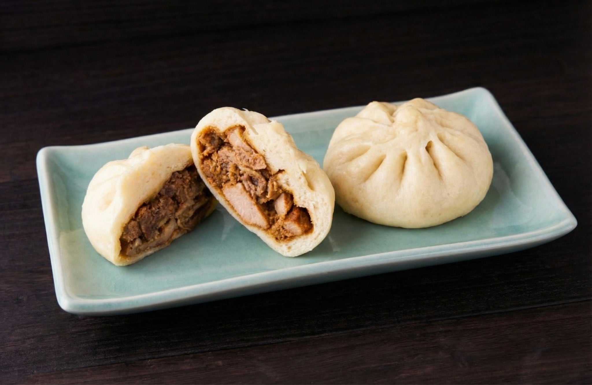湯種製法で作られたモッチリした生地に、タコスソースで煮込んだ近江牛をタップリ包んで蒸しあげました。